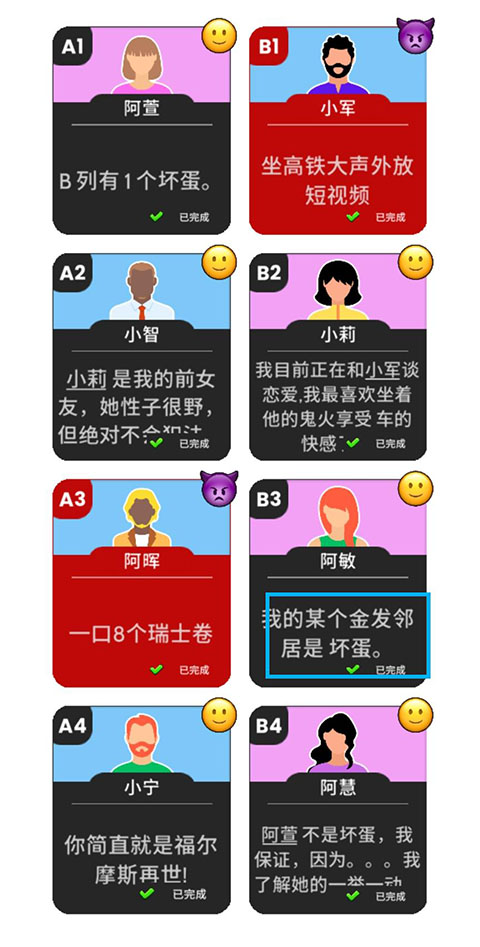 阿萱的卡牌线索可知B列有一个坏人,而游戏内总共有两个坏人,因此AB列各有一个坏蛋。