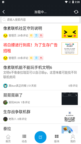 1、首先我们进入像素联机软件当中,在首页我们可以看到大量的联机游戏、加速游戏、其他游戏等等,然后进入到玩家社区;