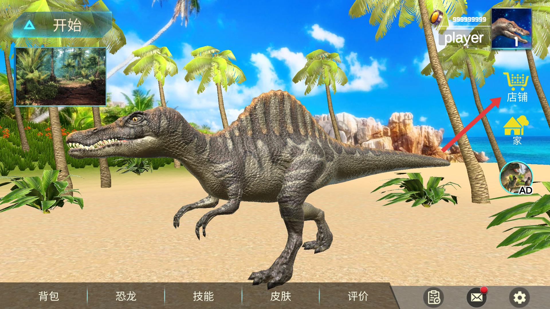 2、进入游戏后,在恐龙展示场景中,可点击右侧店铺图标,进入店铺界面,准备购买道具。