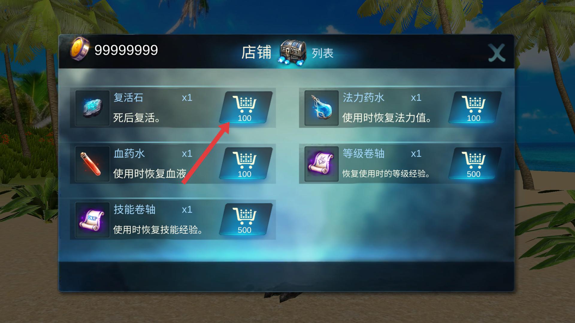 3、在店铺界面,能看到多种道具,若要购买复活石,点击复活石旁标有100的购物车按钮,消耗对应货币即可。