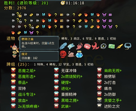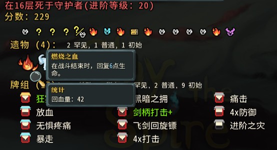 如图是一层因为缺少防御手段暴毙蹲起的情况。这个比较抽象的路线里总共有7个怪,燃烧之血提供了42点回复,至少也是让你在火堆多了一次敲牌的机会,提高了很多的容错。可以说燃烧之血功不可没。