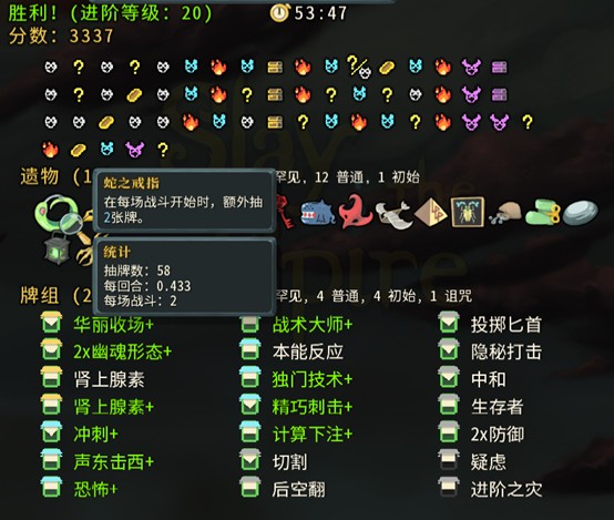 华贼碎心胡局,蛇之戒指平均每回合抽牌0.433,计算一下就是每场战斗进行了不到5个回合。在攻杀为主体思路的尖塔里,用足够的输出快速结束战斗、减少战损是主流打法,因此启动的要求非常高,蛇之戒指的价值也更高了。