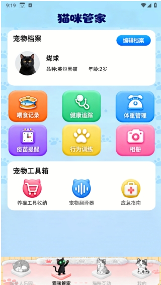 在猫咪管家页面中可以进行喂食记录、健康追踪、体重管理、疫苗提醒、行为训练,同时还有宠物工具箱;
