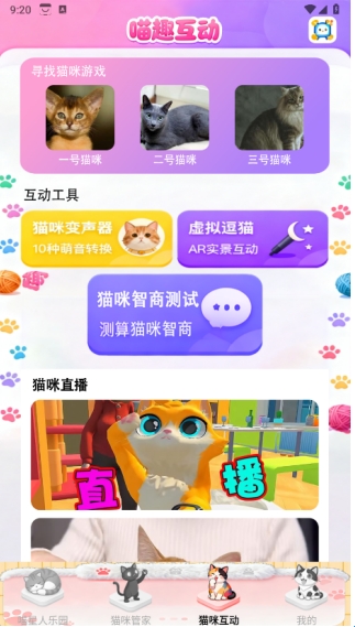 在猫咪互动页面中可以进行寻找猫咪游戏、猫咪变声器、虚拟逗猫以及猫咪智商测试等操作。