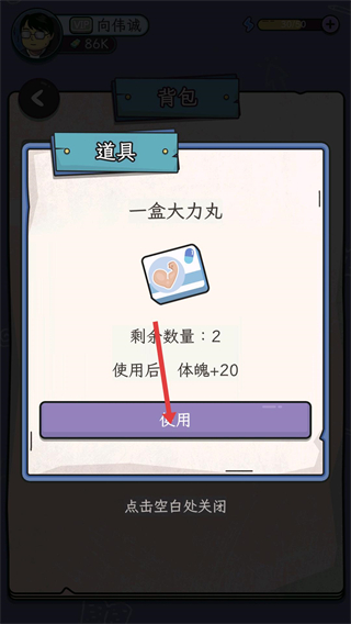4、点击使用按钮,使用一盒大力丸,增强角色体魄,提升在工作、生活中的表现能力。