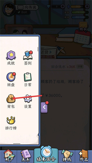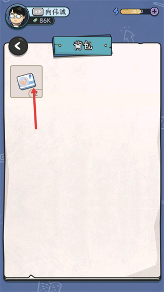 1、点击箭头按钮,查看背包与成就等,获得道具,推进剧情与游戏进程。