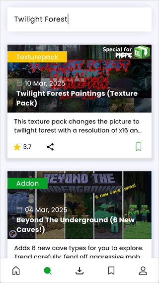 1、使用MCPEDL软件搜索功能,输入模组英文名称(如Twilight Forest)进行查找