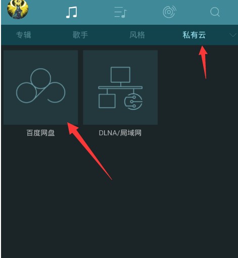 2、想要在线听歌的朋友,就需要先点击“私人云”功能,从其中点击登录自己的百度网盘账号。