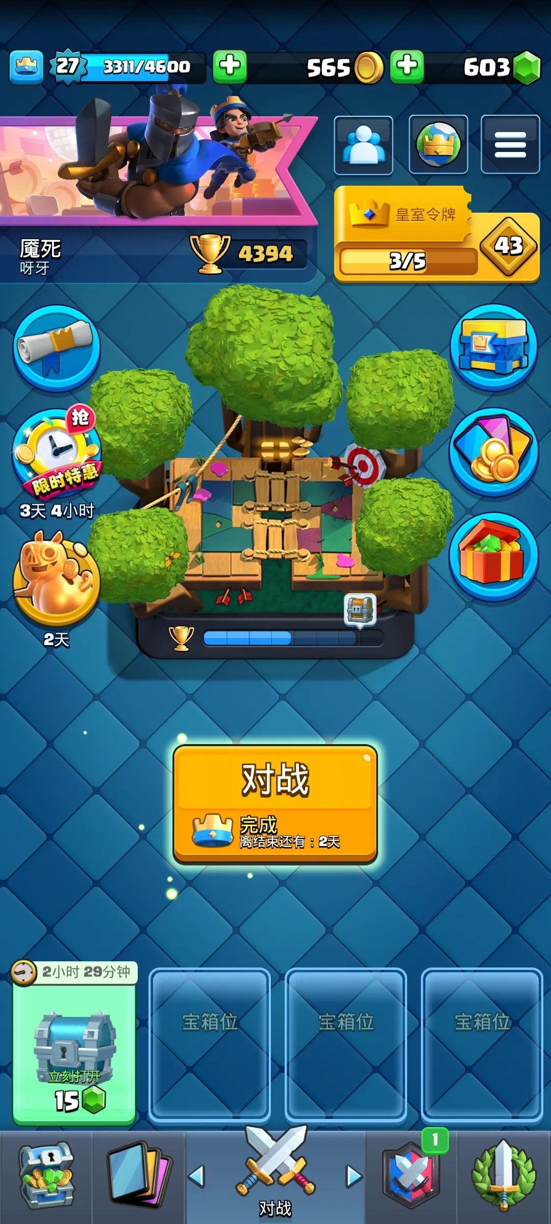 1、开宝箱。宝箱是开出金币,卡牌甚至是钻石的基本的方法。在赢得一场对战胜利后会还有新的宝箱出现,点击宝箱会有冷却时间提示等过了这段时间在此点击能开出随机不同等奖励物件。宝箱一般是四小时的白银箱子和八小时的金箱子。每天只要不空时间就好,基本上每天也就打个四五个箱子就够,技术可以的话,花不了多长时间,而且平时每开一个箱子,就可以打一把,跟上进度不消耗太多时间。