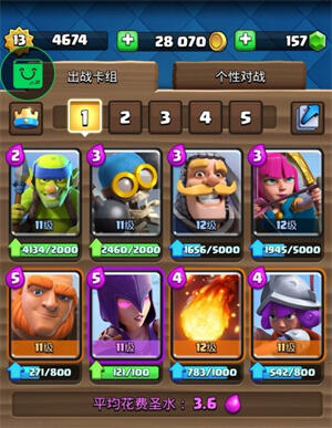 卡组搭配:骷髅军团+哥布林飞桶+飞龙宝宝+野蛮人滚桶+哥布林小屋+火球+骷髅墓碑+猎人,平均消耗圣水3.5。