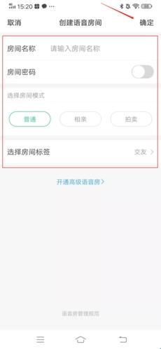 2、这样我们就能进入到“创建语音房间”界面了,在这里将房间名称、模式、标签等信息设置好,如果不想让陌生人加入,还可以勾选设置房间密码,设置完毕后,点击右上方的“确定”。