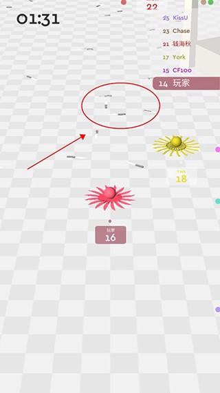 在游戏前期,玩家需要控制球体拾取地上散落的飞刀,拾取的飞刀越多积分就越高,战斗力就越高,玩家在右上角可以看到自己的积分排名。