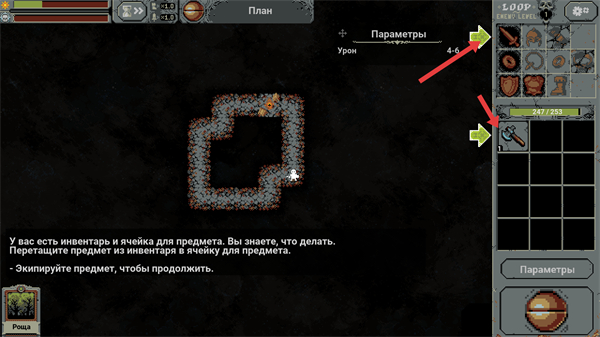 4、拥有inventory和物品栏需将inventory中的物品转移到物品栏,按提示装备物品如斧头参数面板显示伤害完成操作继续冒险。
