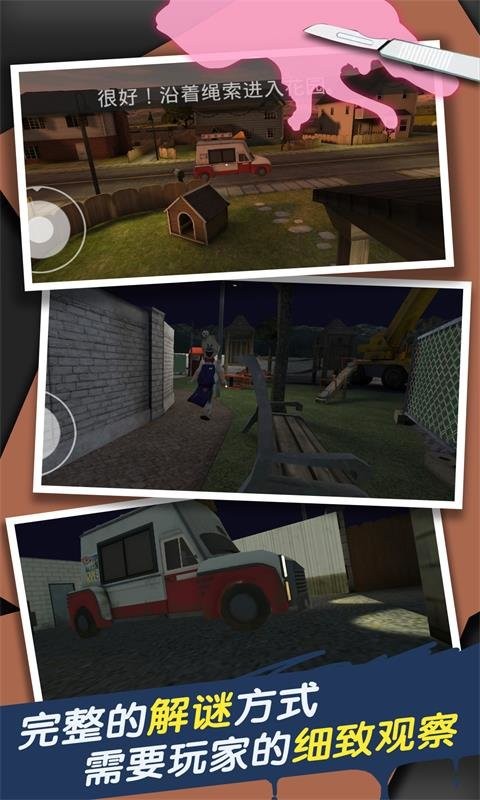 1、进入游戏后,先熟悉方向控制轮盘和蹲下等操作。仔细观察初始场景,留意周围环境细节,寻找可能有用的线索和道具。