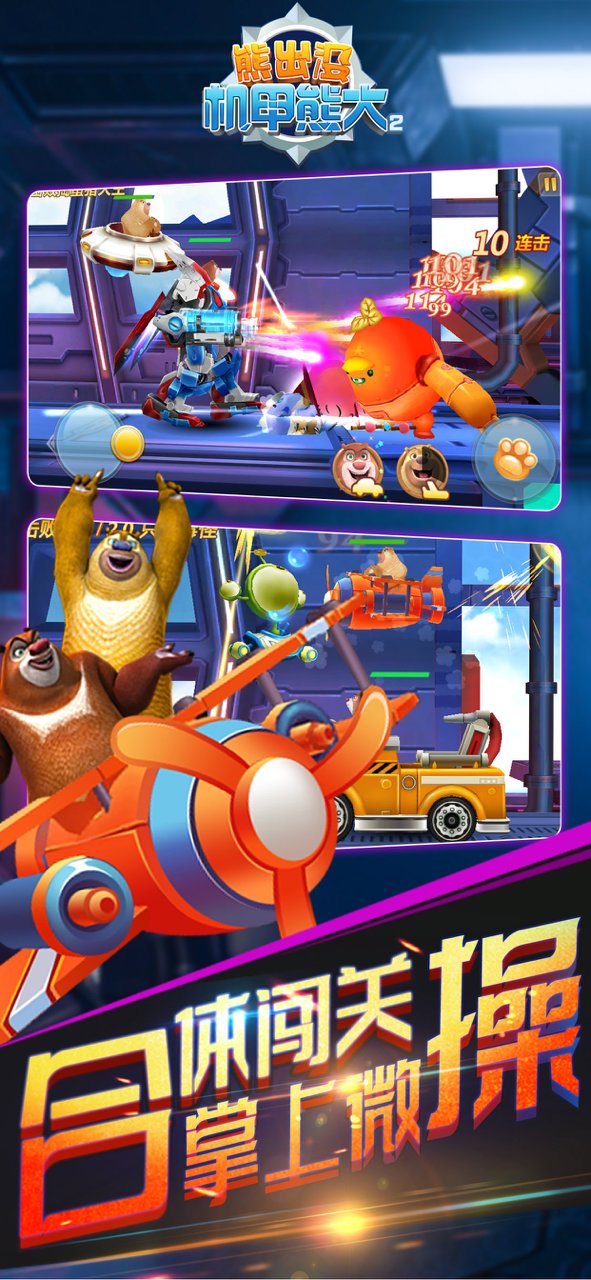 游戏采用动画中的形象和语音,使玩家置身于熊出没的世界中,化身熊大熊二,驾驶飞机机甲,亲手保卫森林!