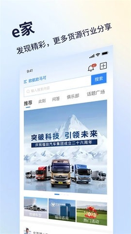 福田e家是福田汽车精心打造的一站式用户服务平台。它集车辆管理、服务预约、配件商城等多功能于一体,为车主带来便捷高效的体验。车主可随时查询车辆状态、在线预约保养维修,节省时间。配件商城提供原厂正品配件,品质有保障。此外,平台还有丰富的资讯内容与优惠活动。福田e家以贴心服务、实用功能,成为福田车主信赖的出行好帮手。