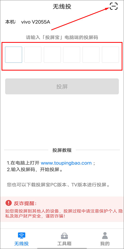 2、然后我们再在手机上下载并打开投屏宝app,在这里输入刚才得到的投屏码或使用扫描功能扫描二维码,然后点击投屏即可;