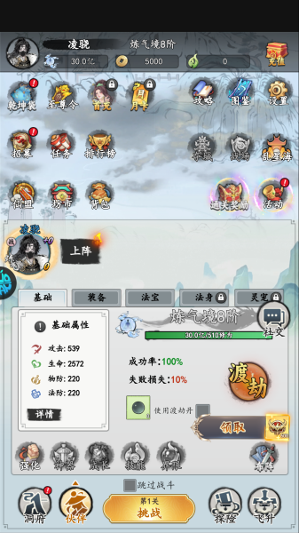 2、点击“挑战”,开启冒险,在战斗过程中获取资源与经验。