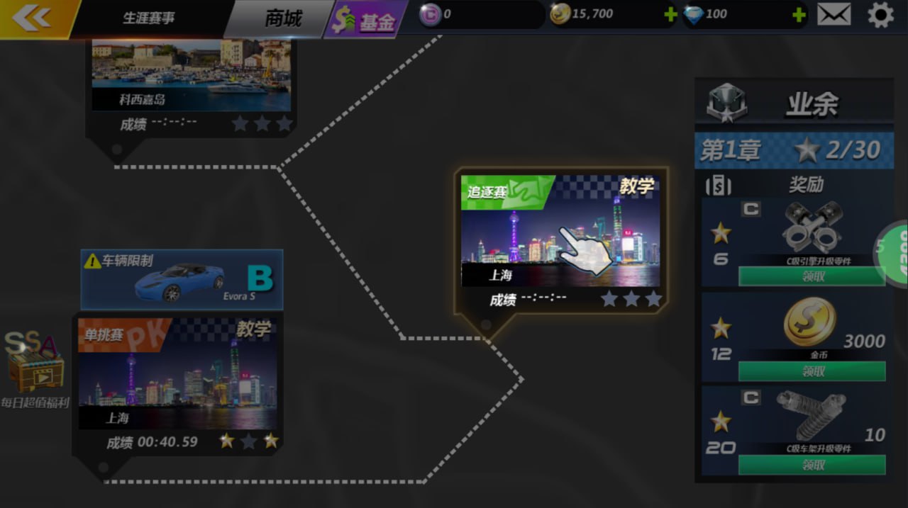 2、进入赛事中选择第一章节并选择赛道。
