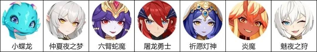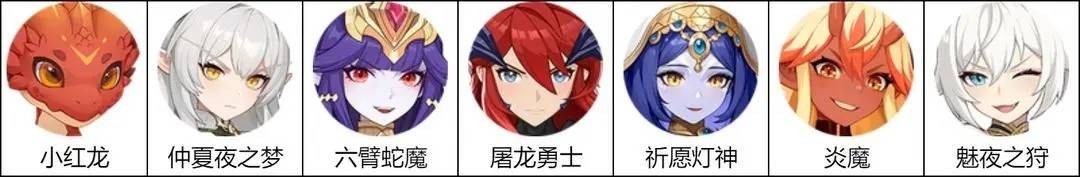 组成角色:仲夏夜之梦、六臂蛇魔、屠龙勇士、祈愿灯神、炎魔、魅夜之狩