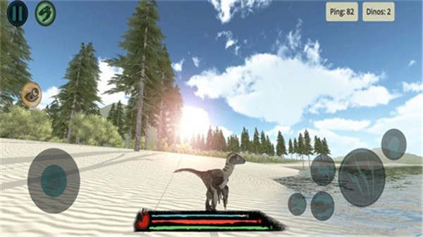 1、游戏界面:游戏界面简洁明了,主屏幕左侧控制恐龙的移动,右侧则是攻击、奔跑、休息和喊叫的按钮。屏幕正下方的三个进度条显示玩家的状态属性,包括饥渴值(蓝色)、血量(红色)和精力条(绿色)。