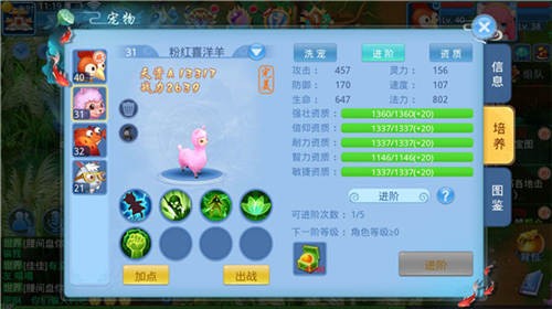 游戏的部分很多宠物都是可以进阶的,不同类型的宠物可进阶的次数不同,进阶后可以增加宠物的资质和成长,并且可以改变宠物的造型