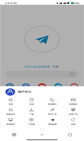 2、App提供多种操作工具,包括收藏夹、历史记录、下载内容、夜间模式等。