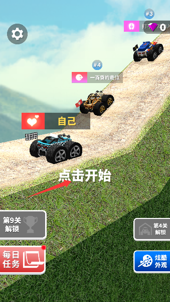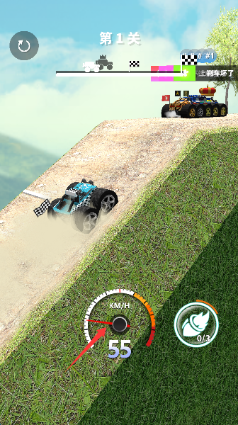 2、通过重力感应控制车辆方向,轻触油门保持平稳行驶,长按加速键激活涡轮增压,在复杂地形中实现精准超车。