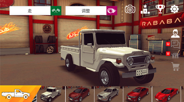 3、游戏的玩法系统简单的分为两个操作部分,一个就是中文翻译下的“走”和“调整”,其次就是关于车库中车型的选择,其中“走”就是大家常见到的挑战模式,这里分别有“多人”和“单人”模式,具体小编就不细说了;“调整”则是大多数赛车竞速游戏中,非常值得学习的地方,在这里你可以自由定制您的赛车,如改变车身颜色,定制车轮,或者处理汽车等多方面细节。