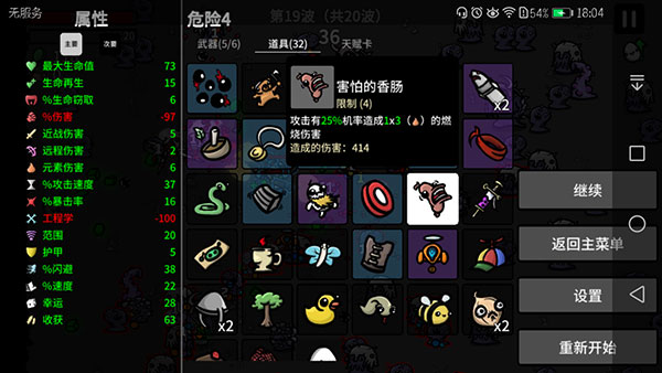 因为小编是在后几波才开始注意到香肠所带的元素伤害的,所以这一局打伤害的伤害并不高。不过有了喷火器之后,一些小怪还是可以秒的。当然可以冲撞的大怪也能杀不过需要4~5秒。