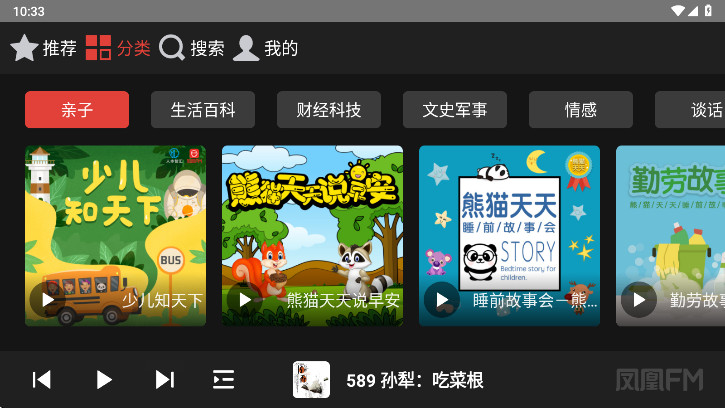 1、凤凰FM手机客户端涵盖了公开课、有声书、音乐等多种类型;
