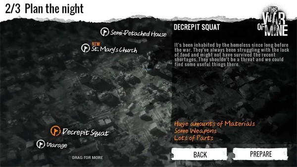 第一天和第二天晚上一般都不会有人来抢劫,第三天才会来强盗,所以第一天晚上除了出去搜刮的人,其他人都睡觉。晚上出去搜刮先去无人区,玩家的人哪个背包多就用哪个,第一次搜刮先别带任何东西,到地点之后把能去的地方都去一下,看看需要挖土或者撬门不,然后带上材料和木头就可以回家了,下次来就带上工具挖土、撬锁撬门。