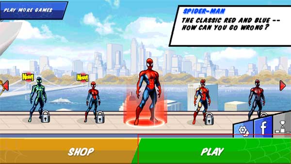 1、打开游戏之后,第一步就是选择你喜欢的蜘蛛侠形态,通过左右滑动进行选择,选择好后之后点击右边的“PLAY”按钮。
