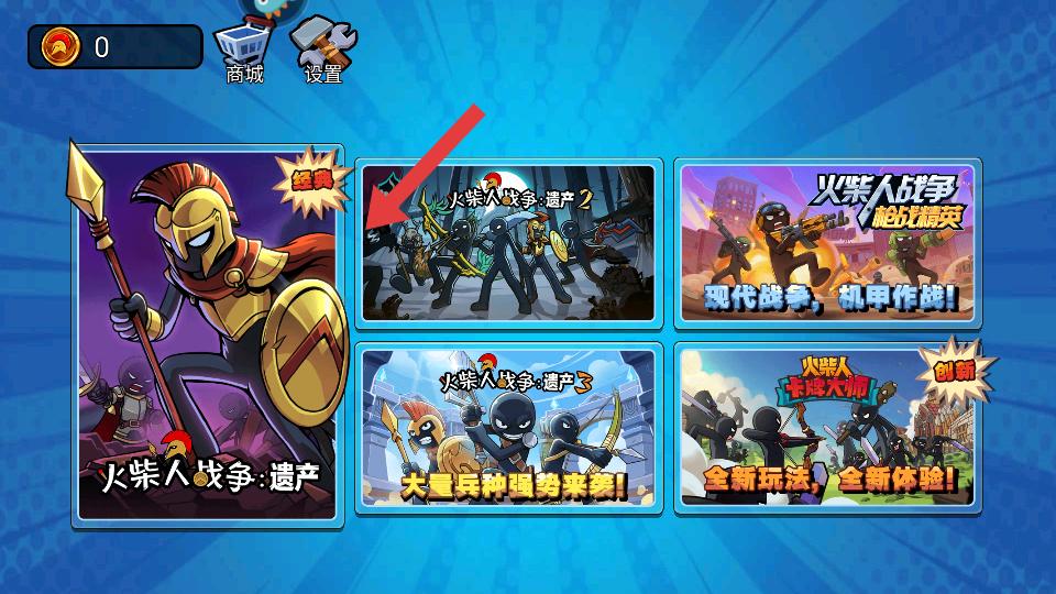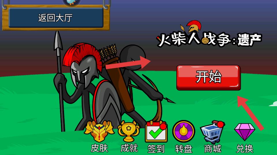 3、以火柴人战争遗产为例,进入后能看到皮肤,成就等功能按钮,点击开始按钮,即可进入该游戏的关卡选择界面。