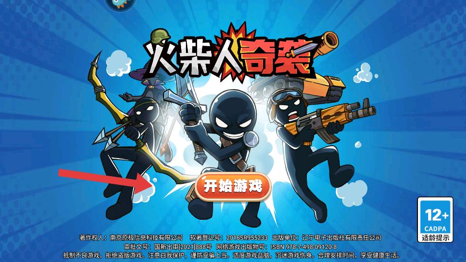 1、进入游戏,能看到火柴人奇袭标题界面,下方有开始游戏按钮,点击它即可开启火柴人的冒险挑战,开启游戏之旅。