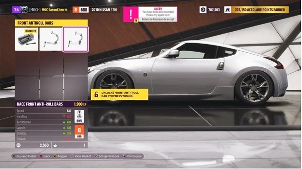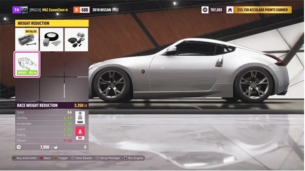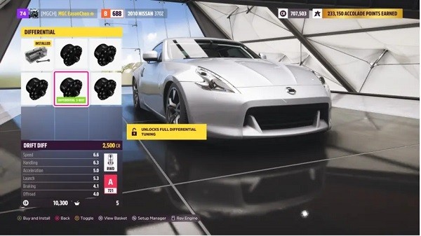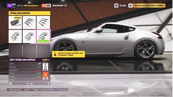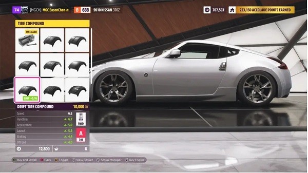 近两年,随着各种漂移赛事的热度逐渐升高,极限竞速也开始注重起漂移这种赛车技巧。 那么什么是漂移?漂移并不意味着失控。车辆打滑导致轮胎空转与地面摩擦产生烟雾也并不能称之为漂移。真正的漂移动作,在从起飘到入弯再到出弯全程都是可以控制的。 而在练习漂移之前我们也需要对车辆进行改装,下面小编以Nissan?370Z为例: