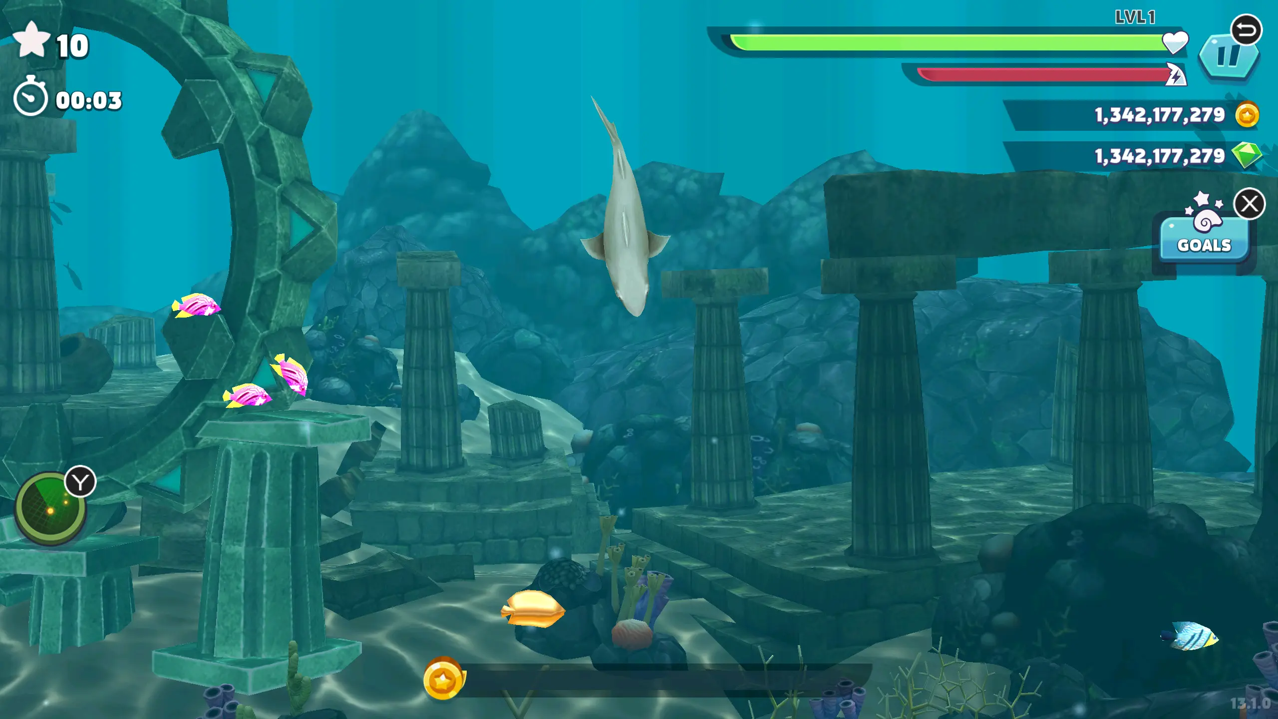我另外收集金币比较多的就是穿过时空门去北极,在那里也是要眼疾手快的吃,还要不时的吃企鹅延长时长,在这里不用怕被大鲨咬死,因为从北极回来还可以再大吃特吃一段时间呐!