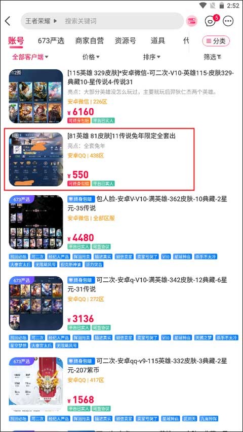 【选号】:设定交易类型、商品类型、价格、游戏档位等实现目标筛选,百里挑一。