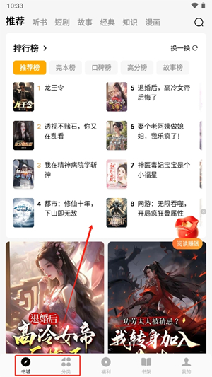 1、打开手机上下载的蛋花免费小说app,在首页推荐、分类等界面找到你想要听书的小说;