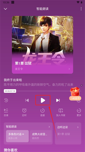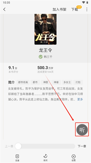 3、在小说界面,点击屏幕中间区域唤起菜单,点击右下角的【听】按钮;