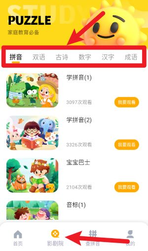 2、进入“影院”模块后,可选择拼音、双语、古诗等主题,播放相关趣味视频学习内容。