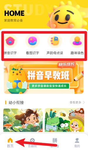 1、打开APP,点击首页的“拼音识字”等图标,即可进入相应识字、母读或填色等互动学习模块。