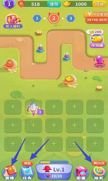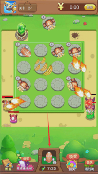 1、在游戏关卡中点击屏幕下方类似炮台的道具(如箭头所指),将其放置在棋盘内的空位上,增强防御火力。
