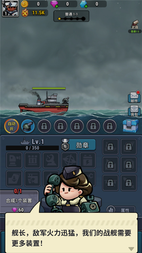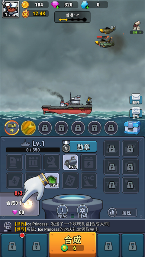 2、合成获得的道具及时点击装备,应对初期海怪袭击,保障战舰安全。