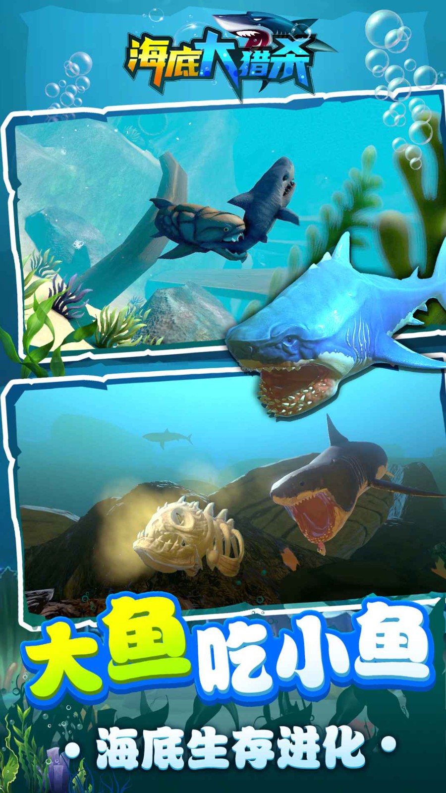 2、化身鲨鱼玩游戏,在奇怪的海底捕食各种各样的鱼!变成越来越强壮的海兽!