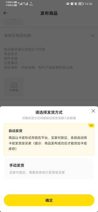 三、在下方发货方式中可以设置自动发货,点击确定后就是自动发货的方式了。