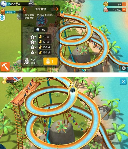 推荐一个滑梯心得,小黄人滑出滑梯入水的瞬间,点击左上角小鸭子下方的位置告别10分吧!