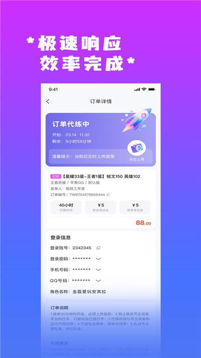 5、按照您的需求下单,填写账号信息,点击立即下单并付款,代练接单后将登录您的账号进行代打。