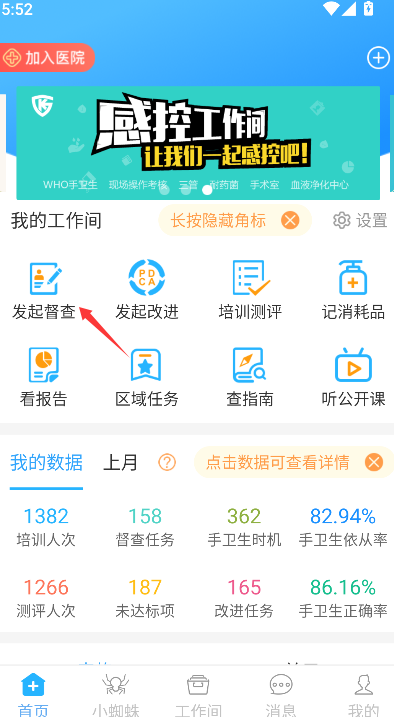 1、可在功能模块区找到并点击"发起督察"选项,系在此可设定检查科室、项目及要求。