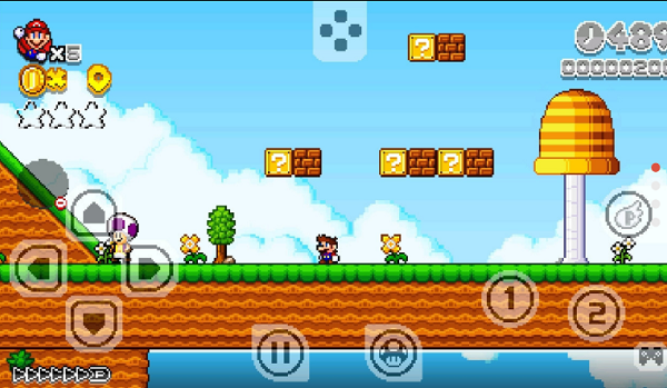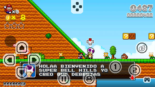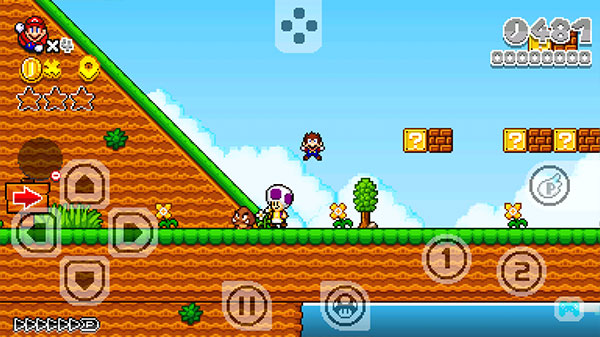 3、进入到游戏,左边控制移动马里奥,1是拾取,2是跳跃